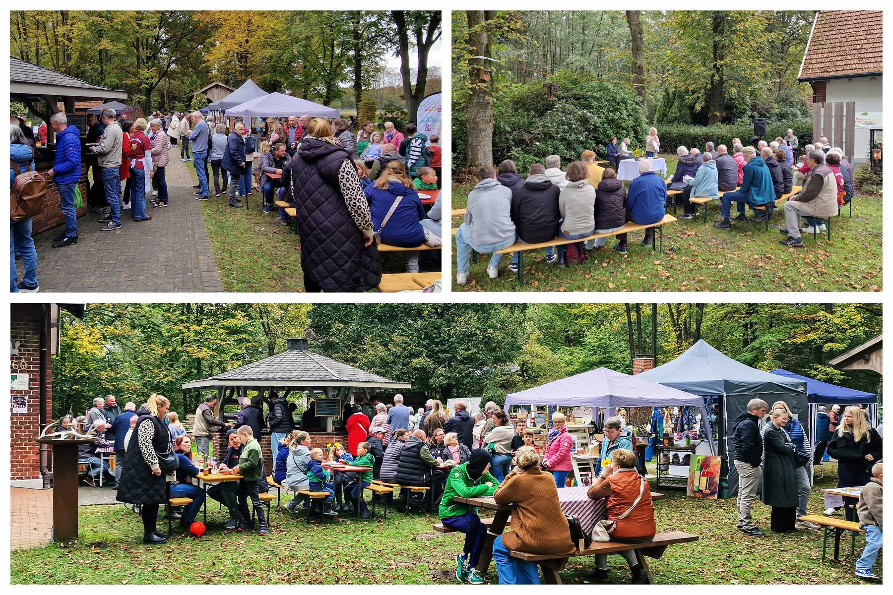 Heimatvereinsvorsitzender Reinhold Gertz bedankte sich am Ende des Gottesdienstes bei allen Akteuren und allen Teilnehmern. Dann ging es in Richtung Frühschoppen für die trockenen Kehlen und zum Bummeln über den kleinen Bauernmarkt auf dem gesamten Areal. Da präsentierten sich mit ihren Verkaufsständen Ursula Horstick aus Tungerloh-Capellen mit diversen Kartoffelsorten, Kürbis, frisches Gemüse und Obst, Annette Wende bot Dekoartikel an, Markus Lanfer vom Vorstand, bekannt durch seine Schafe hatte Schafswurst im Angebot. Dirk Lütkenhaus als Bienenfreund und Feuerwehrchef, hatte eigenen Honig im Angebot und Gerd Both die bekannten selbstgemachten Marmeladen.
